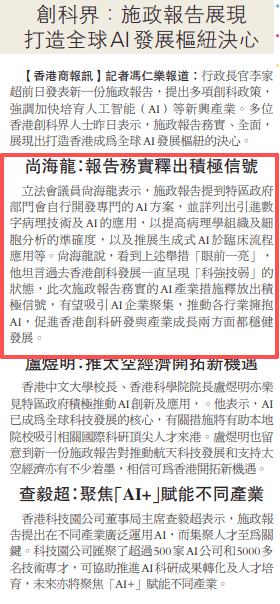 立法會議員尚海龍表示,施政報告提到特區政府部門會自行開發專門的AI方案,並詳列出引進數字病理技術及AI的應用,以提高病理學組織及細胞分析的準確度,以及推展生成式AI於臨床流程應用等。尚海龍說,看到上述舉措 「眼前一亮」,他坦言過去香港創科發展一直呈現 「科強技弱」的狀態,此次施政報告務實的AI產業措施釋放出積極信號,有望吸引AI企業聚集,推動各行業擁抱AI,促進香港創科研發與產業成長兩方面都穩健發展。