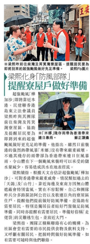 超強颱風「樺加沙」即將靠近本港,民建聯香港島東立法會議員梁熙昨與其團隊前往柴灣及筲箕灣寮屋區,協助及提醒居民要為即將到來的超強颱風做好更充足的準備。他指出,雖然日前襲港的強烈熱帶風暴「米娜」沒有帶來嚴重破壞,不過其殘存的雨帶卻為香港帶來連日狂風暴雨,令山體在下一個颱風來襲時可以承受的儲水量減少,容易造成洪水在地表徑流。