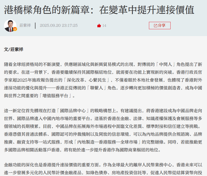 當前,香港正在從傳統的「轉口港」功能,向規則對接、價值提升、國際交流的綜合服務平台轉變。在全球格局持續變化的背景下,香港的新角色不僅僅是傳遞信息,更體現在促進制度、標準與文化的互聯互通。特區政府若能繼續推動制度創新,強化專業服務,提升國際合作水平,香港將能夠進一步鞏固其連接內外的獨特優勢,並在新的全球經濟環境中繼續保持其重要地位。