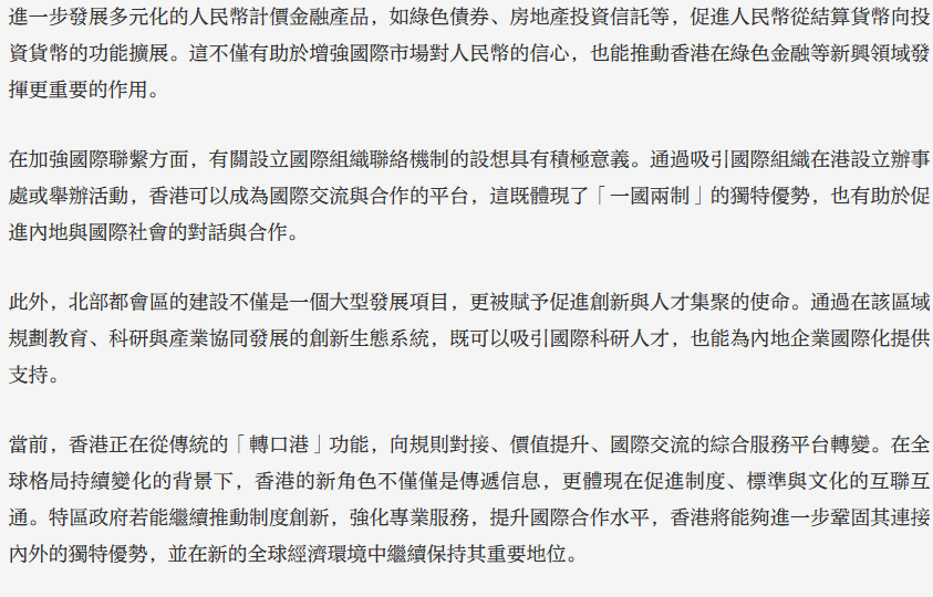在加強國際聯繫方面,有關設立國際組織聯絡機制的設想具有積極意義。通過吸引國際組織在港設立辦事處或舉辦活動,香港可以成為國際交流與合作的平台,這既體現了「一國兩制」的獨特優勢,也有助於促進內地與國際社會的對話與合作。
