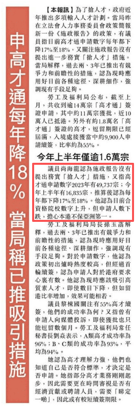 議員尚海龍認為施政報告沒有提出務實「搶人才」措施,又指高才通申請數字2023年有49,737宗;今年上半年有16,835宗,推算後認為每年都下降17%至18%。他認為目前合資格院校數字上升,但申請人數下跌,擔心本港不保亞洲第一。