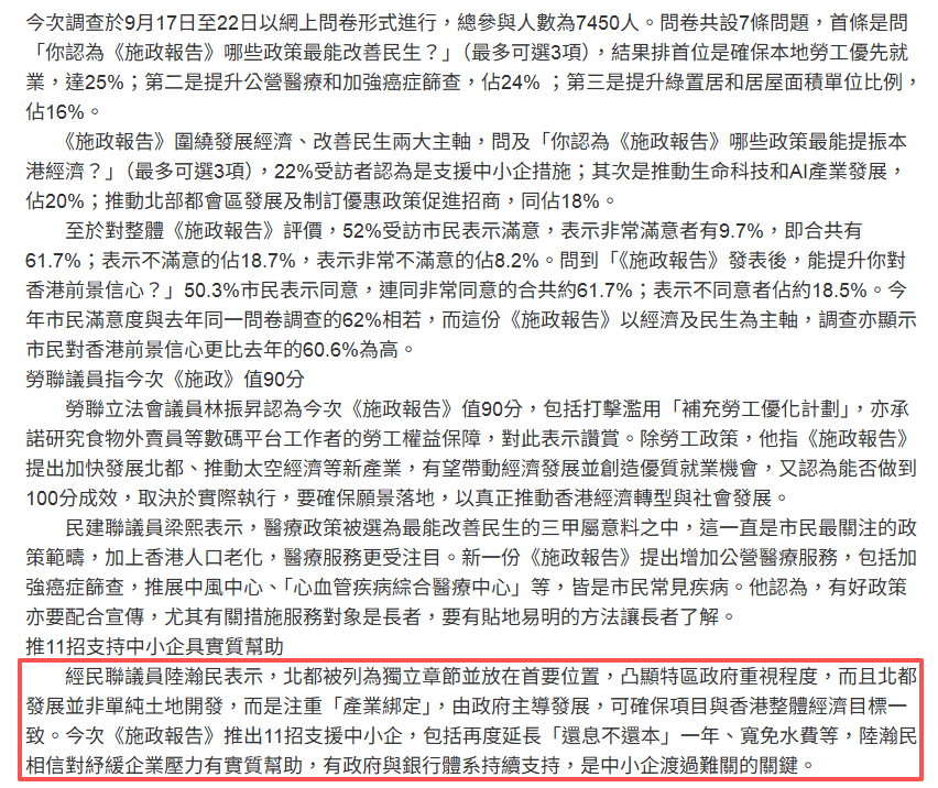 經民聯議員陸瀚民表示,北都被列為獨立章節並放在首要位置,凸顯特區政府重視程度,而且北都發展並非單純土地開發,而是注重「產業綁定」,由政府主導發展,可確保項目與香港整體經濟目標一致。今次《施政報告》推出11招支援中小企,包括再度延長「還息不還本」一年、寬免水費等,陸瀚民相信對紓緩企業壓力有實質幫助,有政府與銀行體系持續支持,是中小企渡過難關的關鍵。