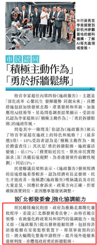 經民聯陸瀚民則指,政府為推動北都簡化審批程序,並設立「北都發展委員會」,由特首親自領導,有助強化跨政策局和部門的協調能力。他又指,《施政報告》提出發展遊艇經濟,包括容許訪港遊艇在安裝監察裝置下,毋須事前預約泊位,將大幅簡化繁複申請程序,提升境外遊艇來港便利度,亦體現政府勇於拆牆鬆綁。