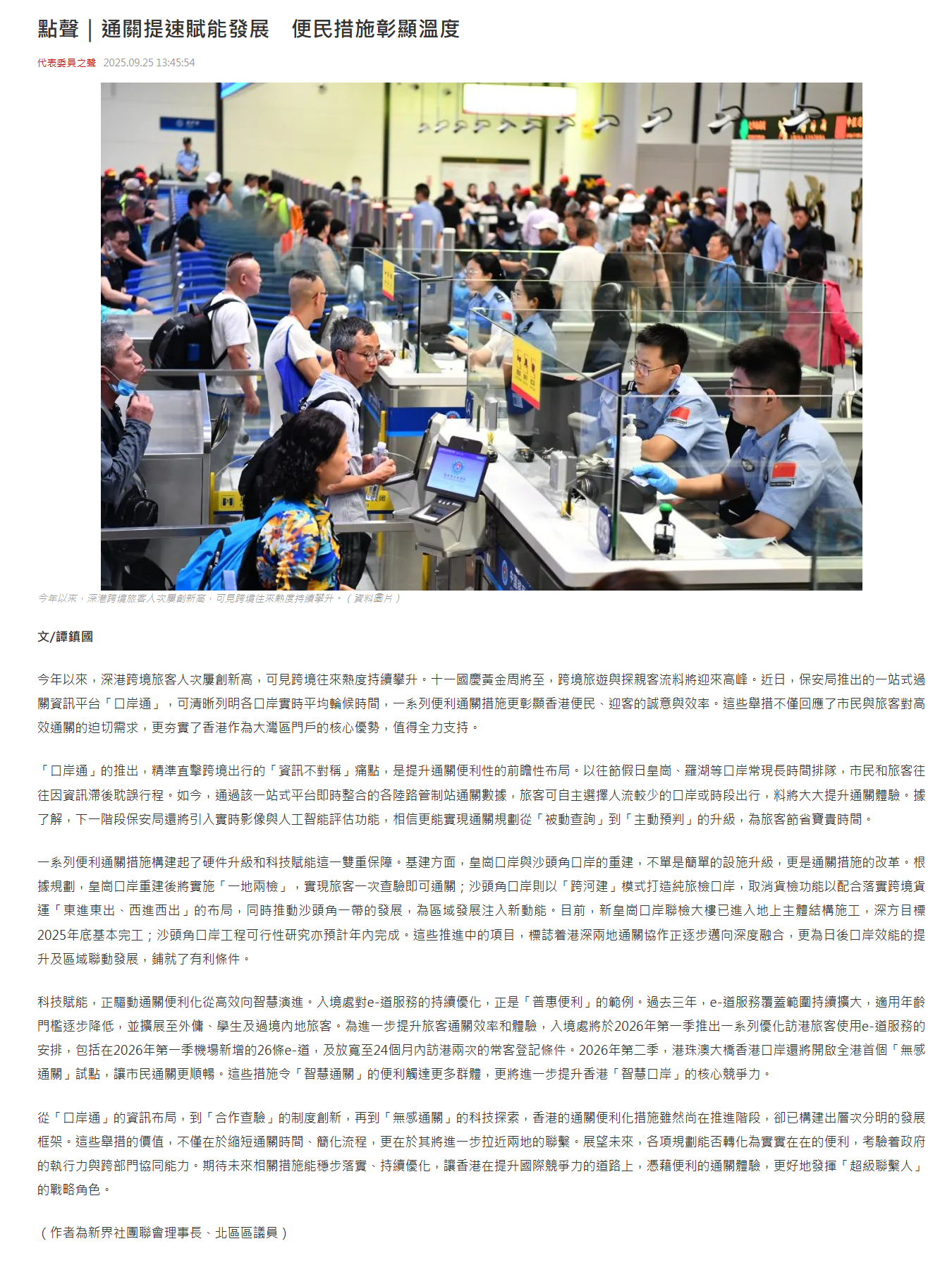 今年以來,深港跨境旅客人次屢創新高,可見跨境往來熱度持續攀升。十一國慶黃金周將至,跨境旅遊與探親客流料將迎來高峰。近日,保安局推出的一站式過關資訊平台「口岸通」,可清晰列明各口岸實時平均輪候時間,一系列便利通關措施更彰顯香港便民、迎客的誠意與效率。這些舉措不僅回應了市民與旅客對高效通關的迫切需求,更夯實了香港作為大灣區門戶的核心優勢,值得全力支持。