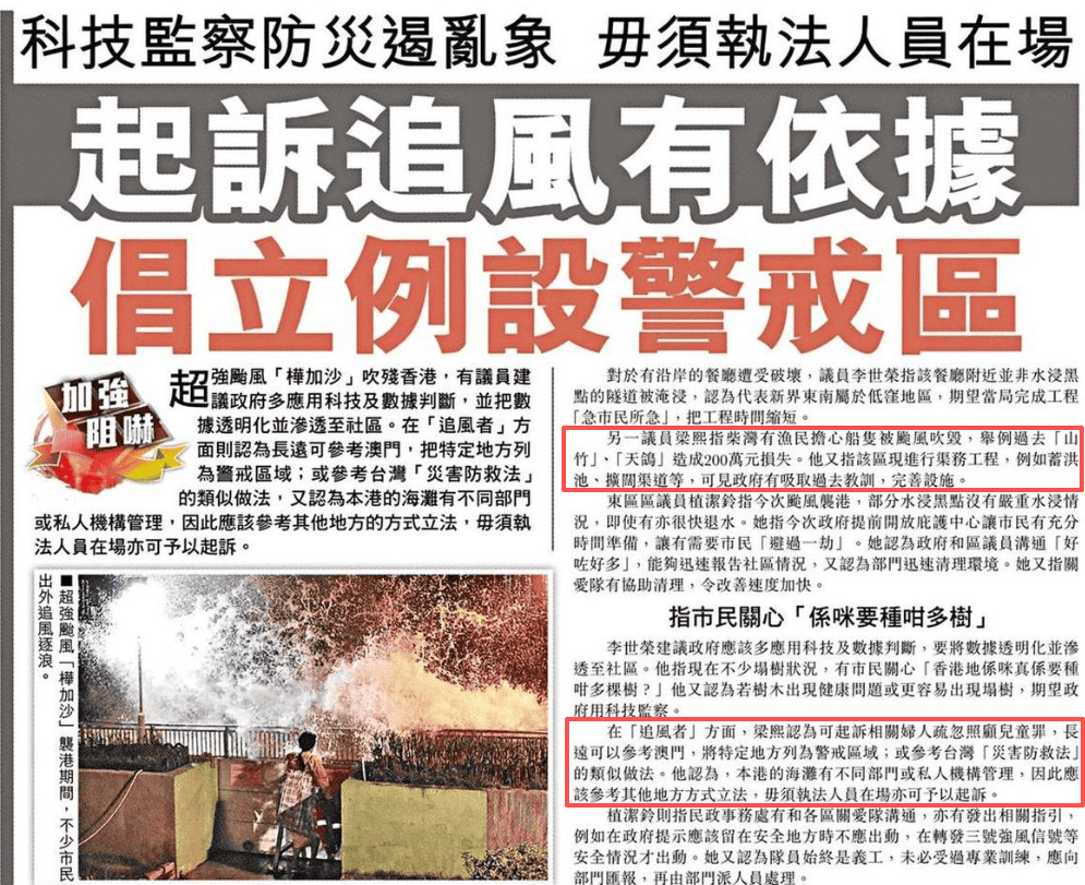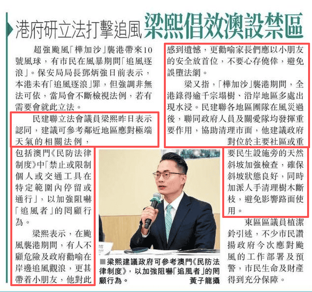 民建聯立法會議員梁熙昨日表示認同,建議可參考鄰近地區應對極端天氣的相關法例,包括澳門《民防法律制度》中「禁止或限制個人或交通工具在特定範圍內停留或通行」,以加強阻嚇「追風者」的罔顧行為。