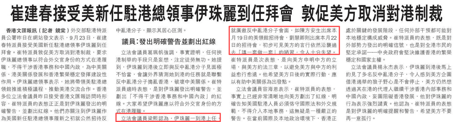 立法會議員梁熙認為,伊珠麗一到港上任,就廣邀反中亂港分子會面,如陳方安生出席本月19日的美領館招待會,劉慧卿則出席本月22日的招待會,初步可見美方的言行依然沿襲過去「講一套做一套」的陋習,令人十分失望。崔特派員是次表態,是向美方申明中方的立場,與美方約法三章,以避免美方與中方的利益愈行愈遠。他希望美方日後的實際行動,應以有助中美關係為出發點。
