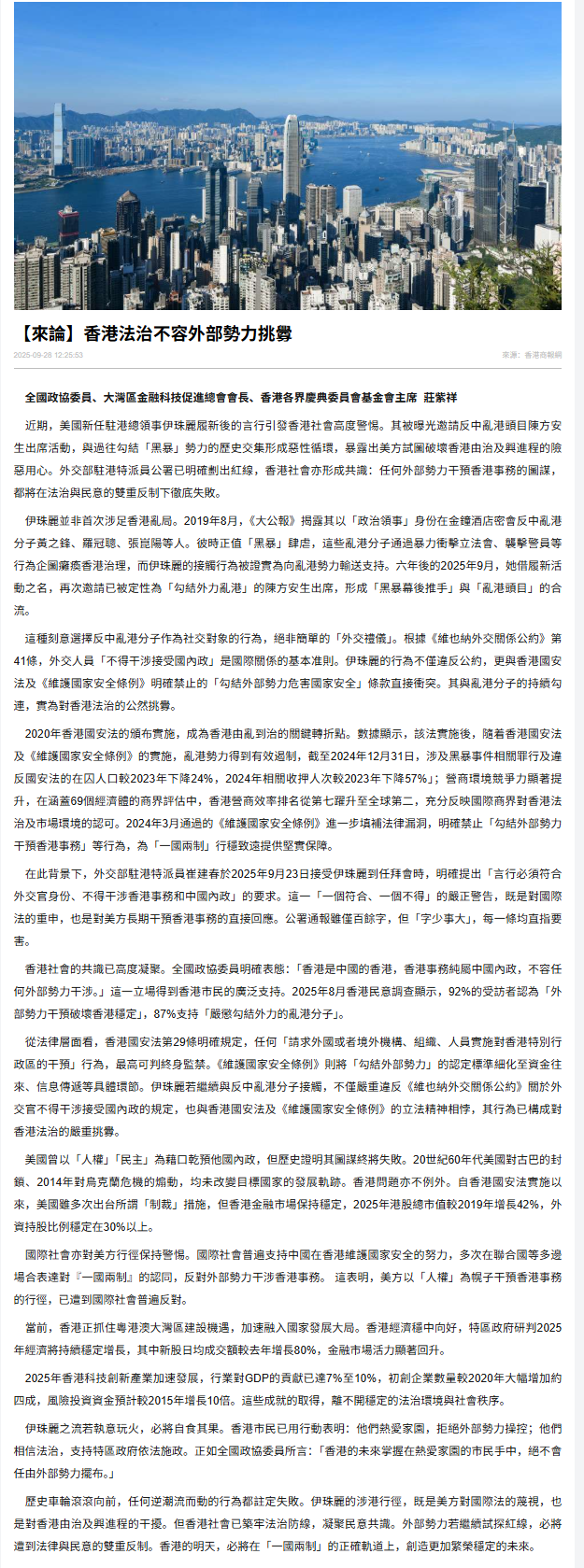 歷史車輪滾滾向前,任何逆潮流而動的行為都註定失敗。伊珠麗的涉港行徑,既是美方對國際法的蔑視,也是對香港由治及興進程的干擾。但香港社會已築牢法治防線,凝聚民意共識。外部勢力若繼續試探紅線,必將遭到法律與民意的雙重反制。香港的明天,必將在「一國兩制」的正確軌道上,創造更加繁榮穩定的未來。