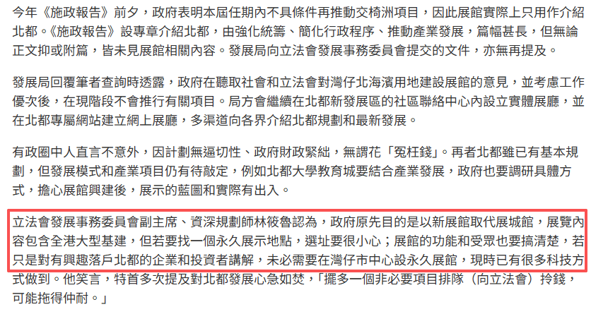 立法會發展事務委員會副主席、資深規劃師林筱魯認為,政府原先目的是以新展館取代展城館,展覽內容包含全港大型基建,但若要找一個永久展示地點,選址要很小心;展館的功能和受眾也要搞清楚,若只是對有興趣落戶北都的企業和投資者講解,未必需要在灣仔市中心設永久展館,現時已有很多科技方式做到。