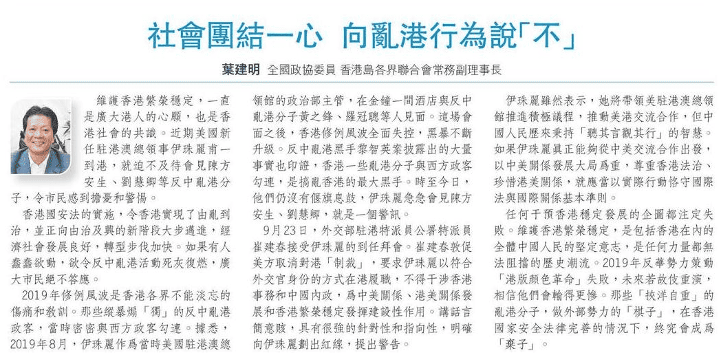 伊珠麗雖然表示,她將帶領美駐港澳總領館推進積極議程,推動美港交流合作,但中國人民歷來秉持「聽其言觀其行」的智慧。如果伊珠麗真正能夠從中美交流合作出發,以中美關係發展大局為重,尊重香港法治、珍惜港美關係,就應當以實際行動恪守國際法與國際關係基本準則。