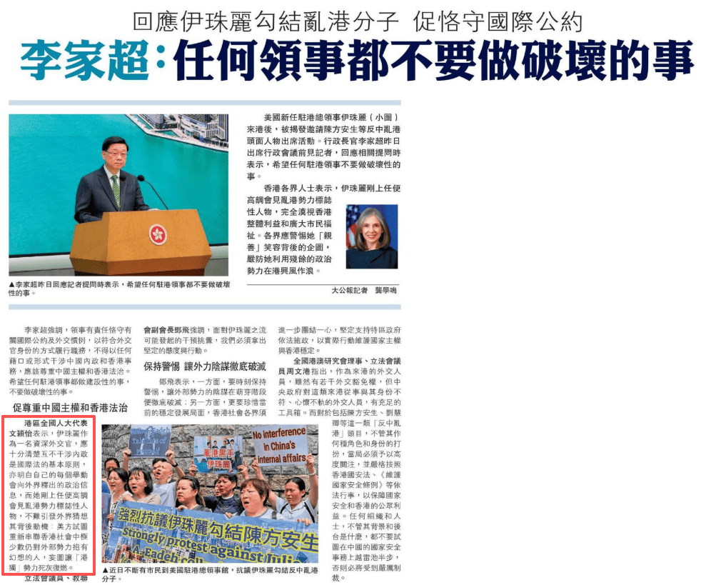 港區全國人大代表文穎怡表示,伊珠麗作為一名資深外交官,應十分清楚互不干涉內政是國際法的基本原則,亦明白自己的每個舉動會向外界釋出的政治信息,而她剛上任便高調會見亂港勢力標誌性人物,不難引發外界猜想其背後動機:美方試圖重新串聯香港社會中極少數仍對外部勢力抱有幻想的人,妄圖讓「港獨」勢力死灰復燃。