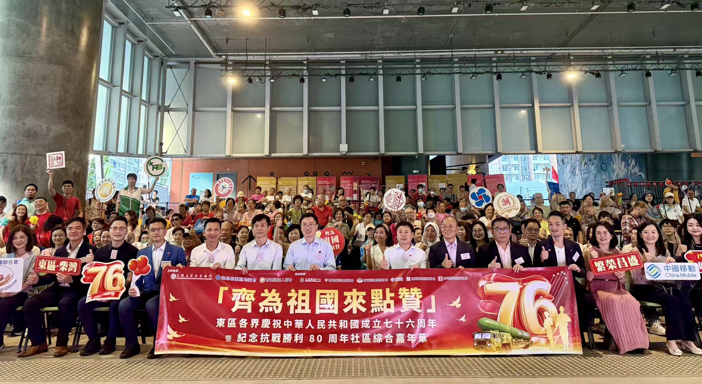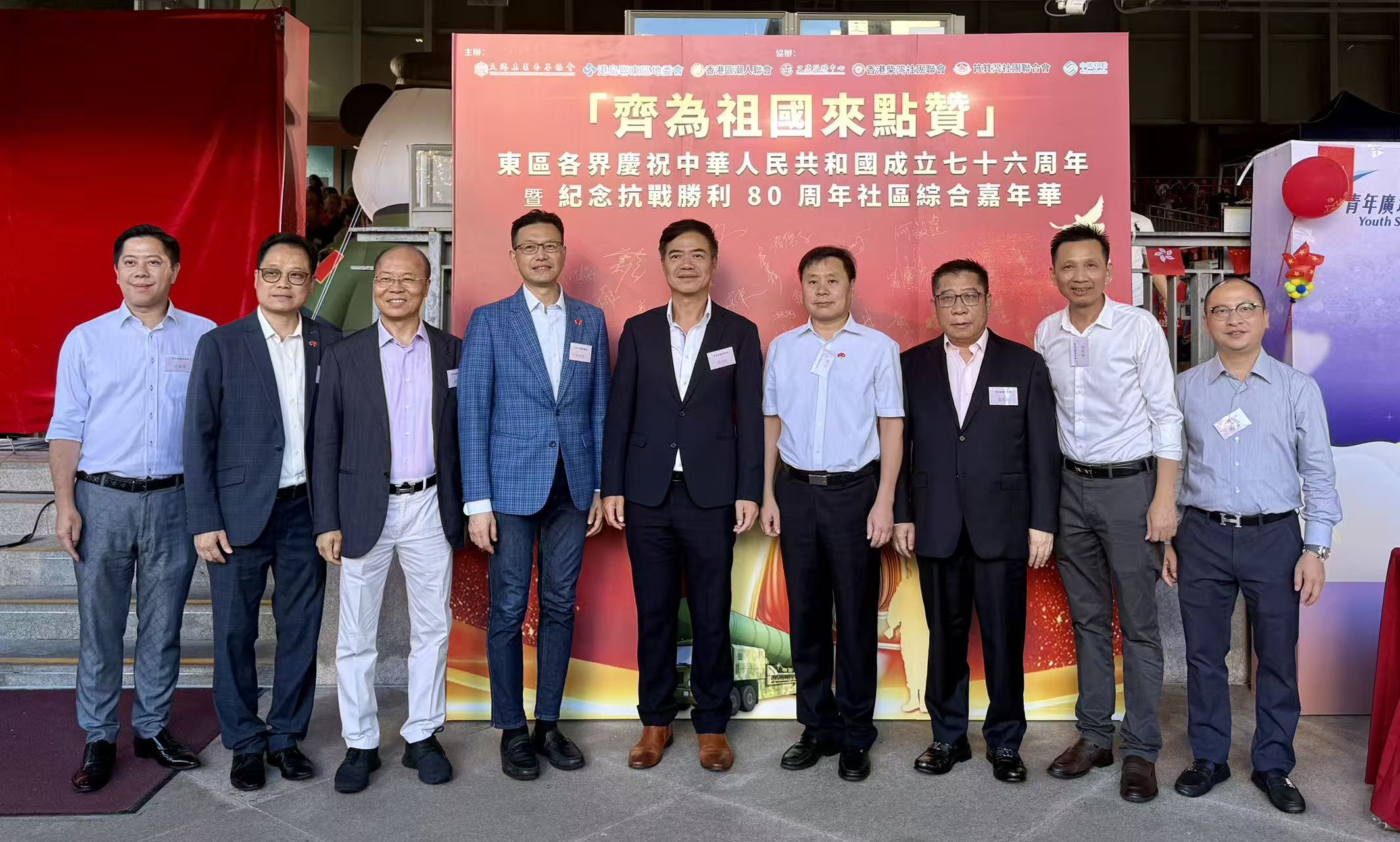 10月1日,由香港東區各界協會、港島聯東區地委會、香港區潮人聯會共同主辦的「齊為祖國來點贊」- 東區各界慶祝中華人民共和國成立七十六周年 暨 紀念抗戰勝利八十周年 社區綜合嘉年華,假柴灣青年廣場舉行,東區民政事務專員黎旨軒、中聯辦港島工作部副部長尤斌出席主禮。