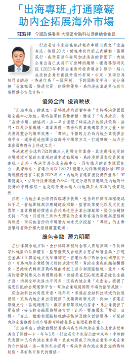 從金融科技的角度來看,近年來,香港在金融科技領域的快速發展,更為內地企業出海提供了技術與創新支持。例如,香港在跨境支付、區塊鏈應用、數字貨幣等領域的探索,為企業提供了更高效、安全的金融服務解決方案。此外,響應國家「雙碳」目標,「專班」推動與國際接軌的碳核算及綠色認證服務,可幫助內地企業應對全球市場對可持續發展日益增長的需求。