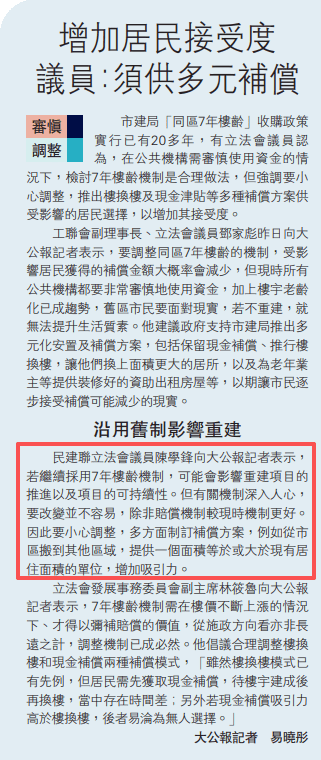 民建聯立法會議員陳學鋒向大公報記者表示,若繼續採用7年樓齡機制,可能會影響重建項目的推進以及項目的可持續性。但有關機制深入人心,要改變並不容易,除非賠償機制較現時機制更好。因此要小心調整,多方面制訂補償方案,例如從市區搬到其他區域,提供一個面積等於或大於現有居住面積的單位,增加吸引力。