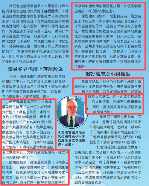 經民聯選委會界別立法會議員陸瀚民接受《大公報》訪問時分析指出,截至去年底,本港共有約1.2萬艘持牌遊艇,但目前全港遊艇泊位只有約4300個,即使計入擬議發展項目,距離遊樂船數量差距仍有一倍之多。他認為,施政報告提出放寬訪港遊艇要求,可於指定水域錨泊,有助紓緩遊艇泊位緊張,但現時擬議增加的遊艇泊位供應項目,大多仍處研究階段,從立項至供應動輒耗時十年。