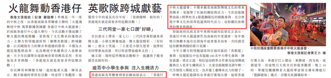 香港南區各界聯會理事長陳南坡表示,「香港仔中秋火龍盛會」不僅承載着南區對傳統文化的尊重與傳承,更凝聚了社區的團結與活力。今次巡遊匯聚南區5間學校及4隊龍獅隊伍的積極參與,充分展現中華文化的深厚底蘊與時代活力,也彰顯民族精神的傳承與創新。
