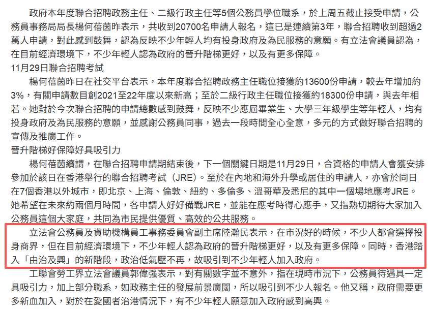 立法會公務員及資助機構員工事務委員會副主席陸瀚民表示,在市況好的時候,不少人都會選擇投身商界,但在目前經濟環境下,不少年輕人認為政府的晉升階梯更好,以及有更多保障。同時,香港踏入「由治及興」的新階段,政治低氣壓不再,故吸引到不少年輕人加入政府。