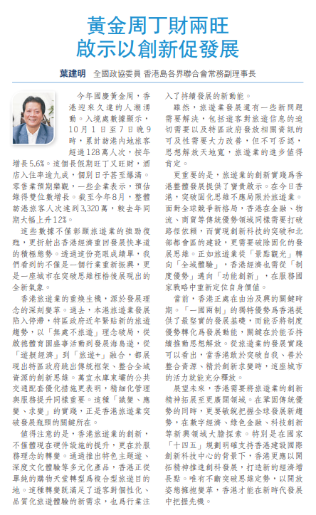 更重要的是,旅遊業的創新實踐為香港整體發展提供了寶貴啟示。在今日香港,突破固化思維不應局限於旅遊業。面對全球競爭新格局,香港在金融、物流、商貿等傳統優勢領域同樣需要打破路徑依賴,而實現創新科技的突破和北部都會區的建設,更需要破除固化的發展思維。正如旅遊業從「景點觀光」轉向「全域體驗」,香港經濟也需從「制度優勢」邁向「功能創新」,在服務國家戰略中重新定位自身價值。