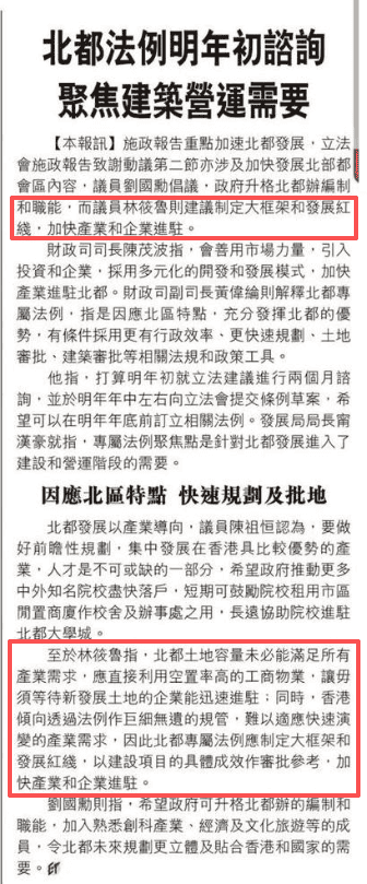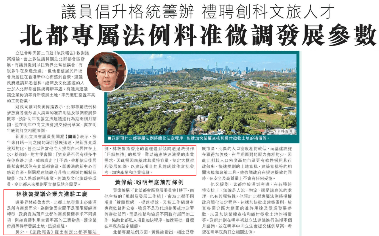 另外,《施政報告》提出制定北都專屬法例,林筱魯指香港的管理體系傾向透過法例作「巨細無遺」的規管,難以適應快速演變的產業需求,因此需因應基建和環境容量,制定大框架和發展紅線,以建設項目的具體成效作審批參考,加快產業和企業進駐。