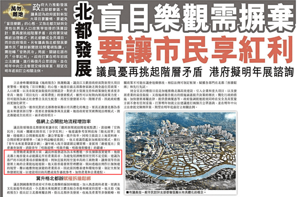 在帶動產業發展方面,議員林筱魯認為為未來應進一步在細節落實變革。他指北都土地容量未必能滿足所有產業需求,為避免經濟轉型因空間不足受阻,建議為落戶的不同產業尋求積極選項,例如直接利用空置率高的工商物業,讓毋須等待新發展土地的企業能迅速進駐。他又指香港發展管理體制,傾向透過法例作巨細無遺的規管,難以適應快速演變的產業需求,因此需因應基建和環境容量,制訂大框架和發展紅線,以建設項目的具體成效作審批參考,加快產業和企業進駐。