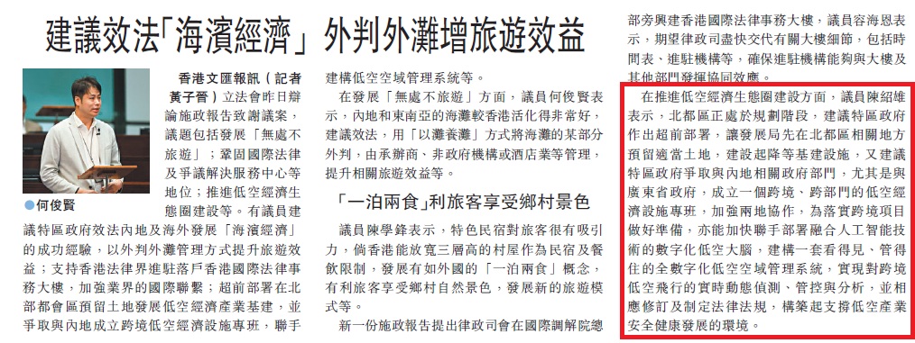 在推進低空經濟生態圈建設方面,議員陳紹雄表示,北都區正處於規劃階段,建議特區政府作出超前部署,讓發展局先在北都區相關地方預留適當土地,建設起降等基建設施,又建議特區政府爭取與內地相關政府部門,尤其是與廣東省政府,成立一個跨境、跨部門的低空經濟設施專班,加強兩地協作,為落實跨境項目做好準備,亦能加快聯手部署融合人工智能技術的數字化低空大腦,建構一套看得見、管得住的全數字化低空空域管理系統,實現對跨境低空飛行的實時動態偵測、管控與分析,並相應修訂及制定法律法規,構築起支撐低空產業安全健康發展的環境。