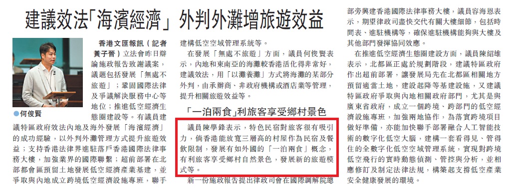 議員陳學鋒表示,特色民宿對旅客很有吸引力,倘香港能放寬三層高的村屋作為民宿及餐飲限制,發展有如外國的「一泊兩食」概念,有利旅客享受鄉村自然景色,發展新的旅遊模式等。