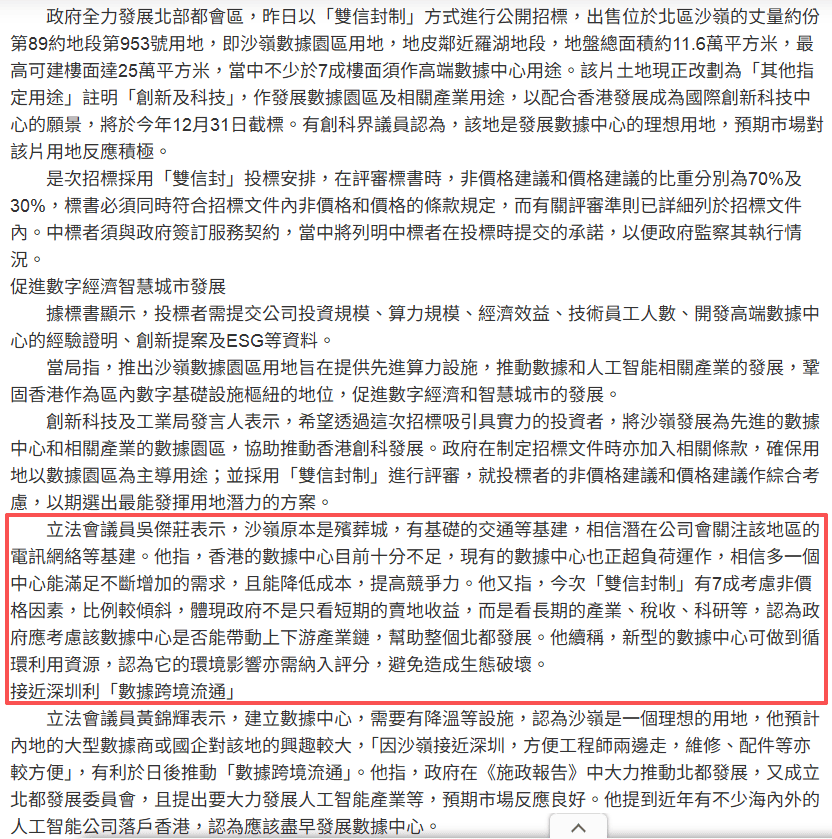 立法會議員吳傑莊表示,沙嶺原本是殯葬城,有基礎的交通等基建,相信潛在公司會關注該地區的電訊網絡等基建。他指,香港的數據中心目前十分不足,現有的數據中心也正超負荷運作,相信多一個中心能滿足不斷增加的需求,且能降低成本,提高競爭力。他又指,今次「雙信封制」有7成考慮非價格因素,比例較傾斜,體現政府不是只看短期的賣地收益,而是看長期的產業、稅收、科研等,認為政府應考慮該數據中心是否能帶動上下游產業鏈,幫助整個北都發展。他續稱,新型的數據中心可做到循環利用資源,認為它的環境影響亦需納入評分,避免造成生態破壞。