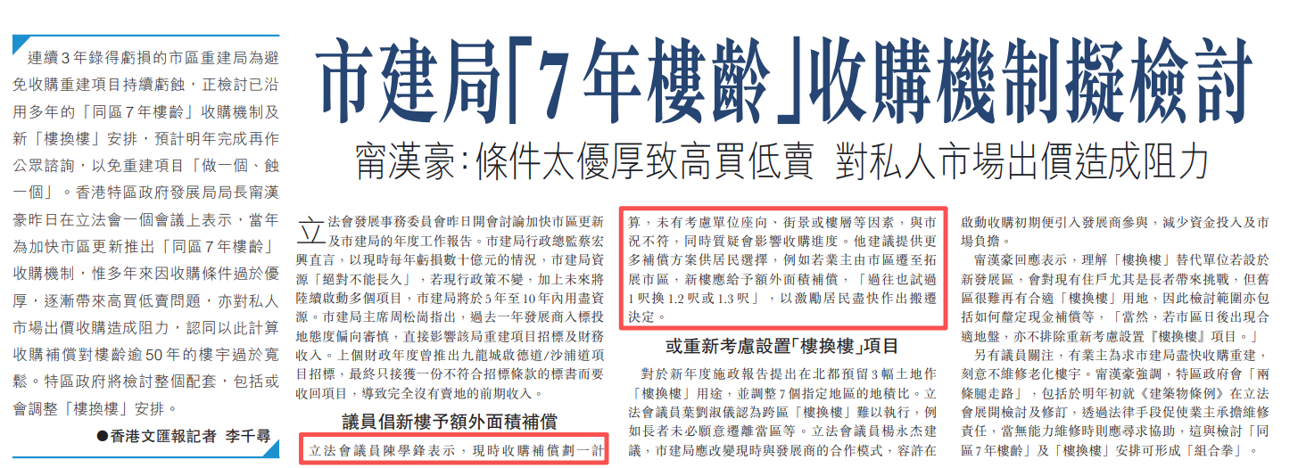 民建聯立法會議員陳學鋒指出,現時收購計算方法是「劃一」,整個重建區,不論座向、街景,也是同一價錢,但正常買樓不是這樣的操作,呼籲政府檢討機制。