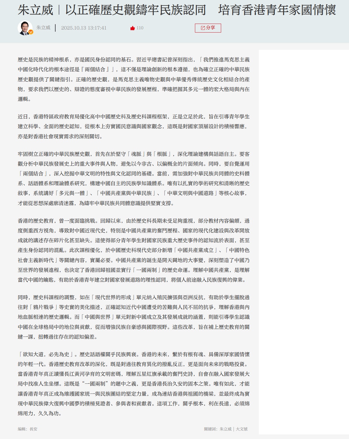 「欲知大道,必先為史」。歷史話語權關乎民族興衰。香港的未來,繫於有根有魂、具備深厚家國情懷的年輕一代。香港歷史教育改革的深化,既是對過往教育異化的撥亂反正,更是面向未來的戰略投資。當香港青年真正讀懂長江黃河孕育的文明密碼,理解五星紅旗承載的奮鬥史詩,自會在融入國家發展大局中找准人生坐標。這既是“一國兩制”的題中之義,更是香港長治久安的固本之策。唯有如此,才能讓香港青年真正成為維護國家統一與民族團結的堅定力量,成為連結香港與祖國的橋梁,並最終成為實現中華民族偉大復興中國夢的積極見證者、參與者和貢獻者。這項工作,關乎根本,利在長遠,必須綿綿用力,久久為功。