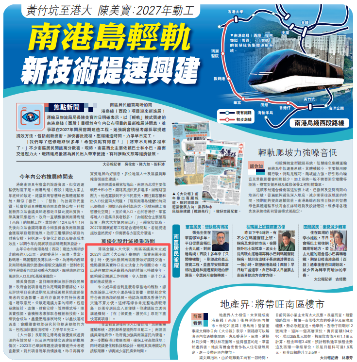 港區全國人大代表、南區區議員朱立威2023年出席《大公報》舉辦的「旅業南圖座談會」時,便指出發展南區需要做好鐵路交通。他點讚陳美寶昨日在立法會上的相關公布,指出過往關於南港島綫西段的討論已持續多年,能夠確定開展工作時間,令人鼓舞,是十分正面的施政措施。