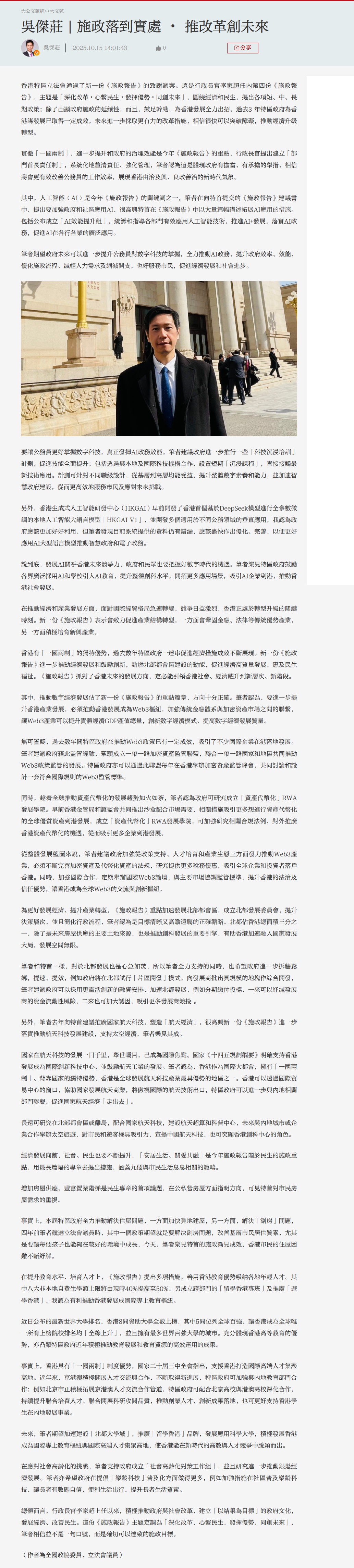 香港有「一國兩制」的獨特優勢,過去數年特區政府一連串促進經濟措施成效不斷展現。新一份《施政報告》進一步推動經濟發展和鼓勵創新,點燃北部都會區建設的動能,促進經濟高質量發展,惠及民生福祉。《施政報告》抓對了香港未來的發展方向,定必能引領香港社會、經濟躍升到新層次、新階段。