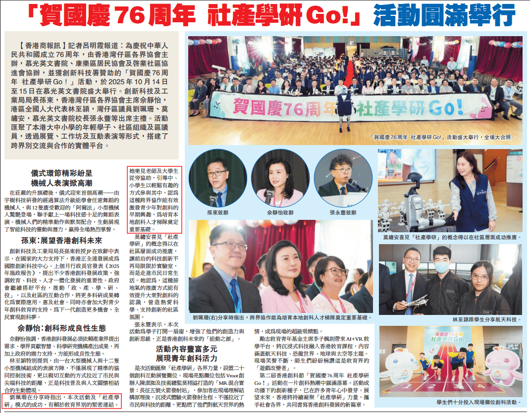 劉珮珊在分享時指出,本次活動及「社產學研」模式的成功,有賴於教育界別的緊密連結。她樂見老師及大學生從旁協助,引導中、小學生以輕鬆有趣的方式參與其中,認為這種跨界協作能有效激發青少年對創科的早期興趣,為培育本地創科人才梯隊奠定重要基礎。