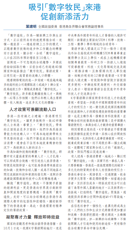 香港一些有識之士建議,香港要吸引「數字牧民」,讓更多做軟件、做AI研發的人士來港。事實上,「數字牧民」帶來的正面效益是多方面的,他們作為具高消費能力的流動人口,可為本地經濟帶來立竿見影的效益。他們不僅在旅居地進行生活消費,還會在不佔用本地就業機會的情況下,為經濟注入新的活力。