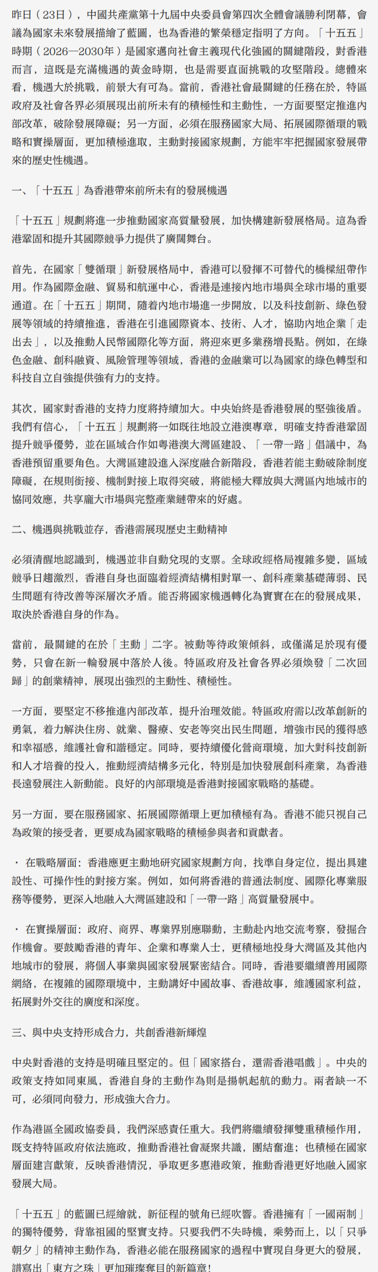 昨日(23日),中國共產黨第十九屆中央委員會第四次全體會議勝利閉幕,會議為國家未來發展描繪了藍圖,也為香港的繁榮穩定指明了方向。「十五五」時期(2026—2030年)是國家邁向社會主義現代化強國的關鍵階段,對香港而言,這既是充滿機遇的黃金時期,也是需要直面挑戰的攻堅階段。總體來看,機遇大於挑戰,前景大有可為。當前,香港社會最關鍵的任務在於,特區政府及社會各界必須展現出前所未有的積極性和主動性,一方面要堅定推進內部改革,破除發展障礙;另一方面,必須在服務國家大局、拓展國際循環的戰略和實操層面,更加積極進取,主動對接國家規劃,方能牢牢把握國家發展帶來的歷史性機遇。
