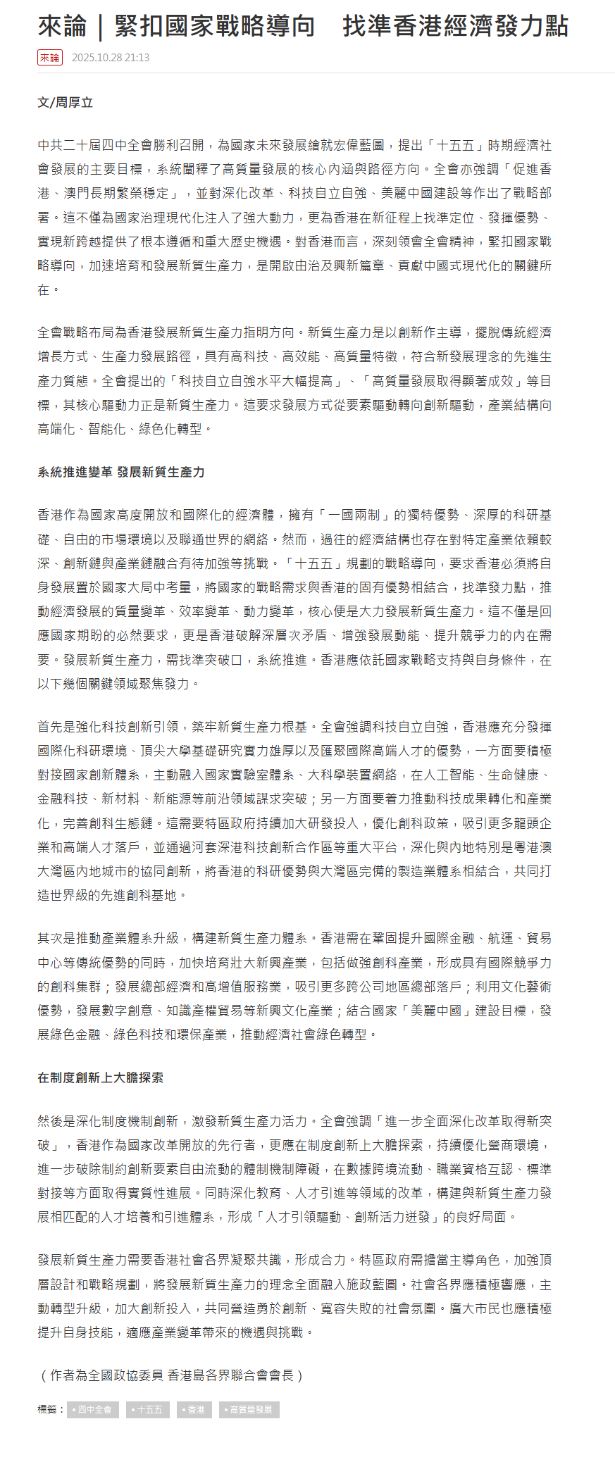 中共二十屆四中全會勝利召開,為國家未來發展繪就宏偉藍圖,提出「十五五」時期經濟社會發展的主要目標,系統闡釋了高質量發展的核心內涵與路徑方向。全會亦強調「促進香港、澳門長期繁榮穩定」,並對深化改革、科技自立自強、美麗中國建設等作出了戰略部署。這不僅為國家治理現代化注入了強大動力,更為香港在新征程上找準定位、發揮優勢、實現新跨越提供了根本遵循和重大歷史機遇。對香港而言,深刻領會全會精神,緊扣國家戰略導向,加速培育和發展新質生產力,是開啟由治及興新篇章、貢獻中國式現代化的關鍵所在。