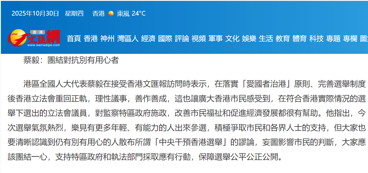 港區全國人大代表蔡毅在接受香港文匯報訪問時表示,在落實「愛國者治港」原則、完善選舉制度後香港立法會重回正軌,理性議事,善作善成,這也讓廣大香港市民感受到,在符合香港實際情況的選舉下選出的立法會議員,對監察特區政府施政,改善市民福祉和促進經濟發展都很有幫助。他指出,今次選舉氣氛熱烈,樂見有更多年輕、有能力的人出來參選,積極爭取市民和各界人士的支持,但大家也要清晰認識到仍有別有用心的人散布所謂「中央干預香港選舉」的謬論,妄圖影響市民的判斷,大家應該團結一心,支持特區政府和執法部門採取應有行動,保障選舉公平公正公開。