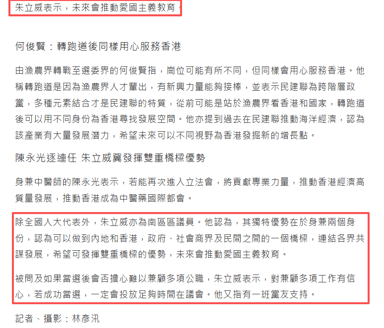 除全國人大代表外,朱立威亦為南區區議員。他認為,其獨特優勢在於身兼兩個身份,認為可以做到內地和
