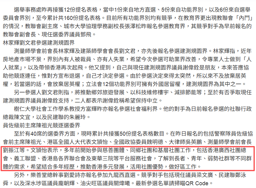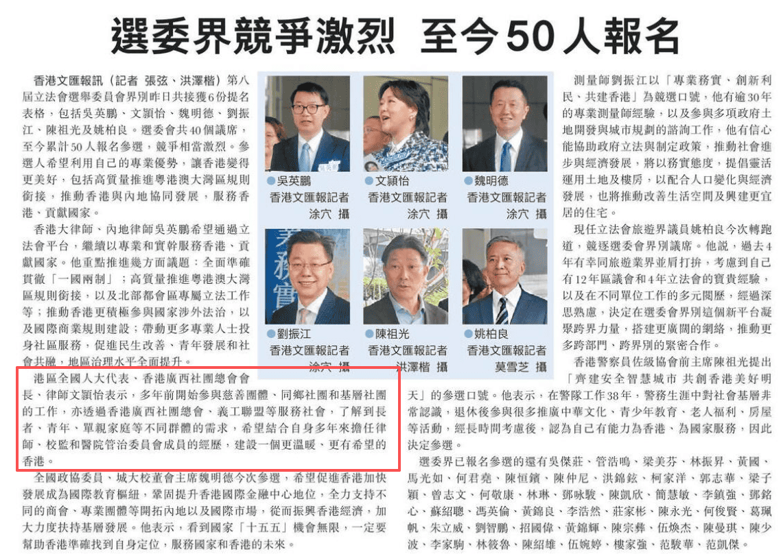 港區全國人大代表、香港廣西社團總會會長、律師文頴怡表示,多年前開始參與慈善團體、同鄉社團和基層社團的工作,亦透過香港廣西社團總會、義工聯盟等服務社會,了解到長者、青年、單親家庭等不同群體的需求,希望結合自身多年來擔任律師、校監和醫院管治委員會成員的經歷,建設一個更溫暖、更有希望的香港。