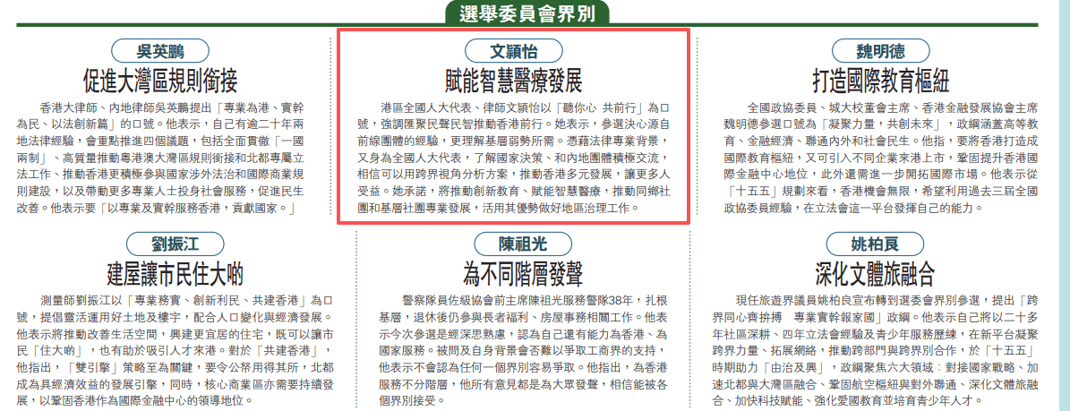 港區全國人大代表、律師文頴怡以「聽你心 共前行」為口號,強調匯聚民聲民智推動香港前行。她表示,參選決心源自前線團體的經驗,更理解基層弱勢所需。憑藉法律專業背景,又身為全國人大代表,了解國家決策、和內地團體積極交流,相信可以用跨界視角分析方案,推動香港多元發展,讓更多人受益。她承諾,將推動創新教育、賦能智慧醫療,推動同鄉社團和基層社團專業發展,活用其優勢做好地區治理工作。