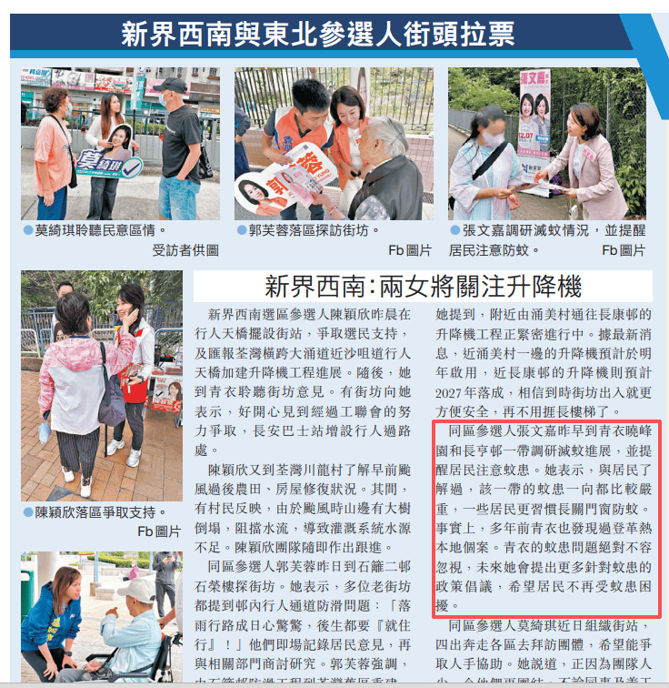同區參選人張文嘉昨早到青衣曉峰園和長亨邨一帶調研滅蚊進展,並提醒居民注意蚊患。她表示,與居民了解過,該一帶的蚊患一向都比較嚴重,一些居民更習慣長關門窗防蚊。事實上,多年前青衣也發現過登革熱本地個案。青衣的蚊患問題絕對不容忽視,未來她會提出更多針對蚊患的政策倡議,希望居民不再受蚊患困擾。