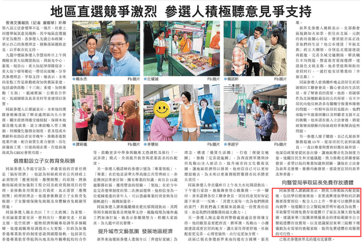 新界北參選人譚鎮國表示,將致力推動區內配套提速,包括學位提速增加,重置或興建新學校的計劃都要落實到位,配合人口上升,學童可以選擇在區內就學。他還關注公立醫院殮房明年起改為收費,爭取醫管局將免費存放遺體日子延長及擴大豁免範圍、建議東華三院擴展殯儀基金的津貼範圍至公立醫院遺體存放費用,以及建議探討東華三院轄下殯儀館為有需要的喪親家庭,提供免費遺體存放服務的可行性。