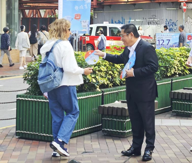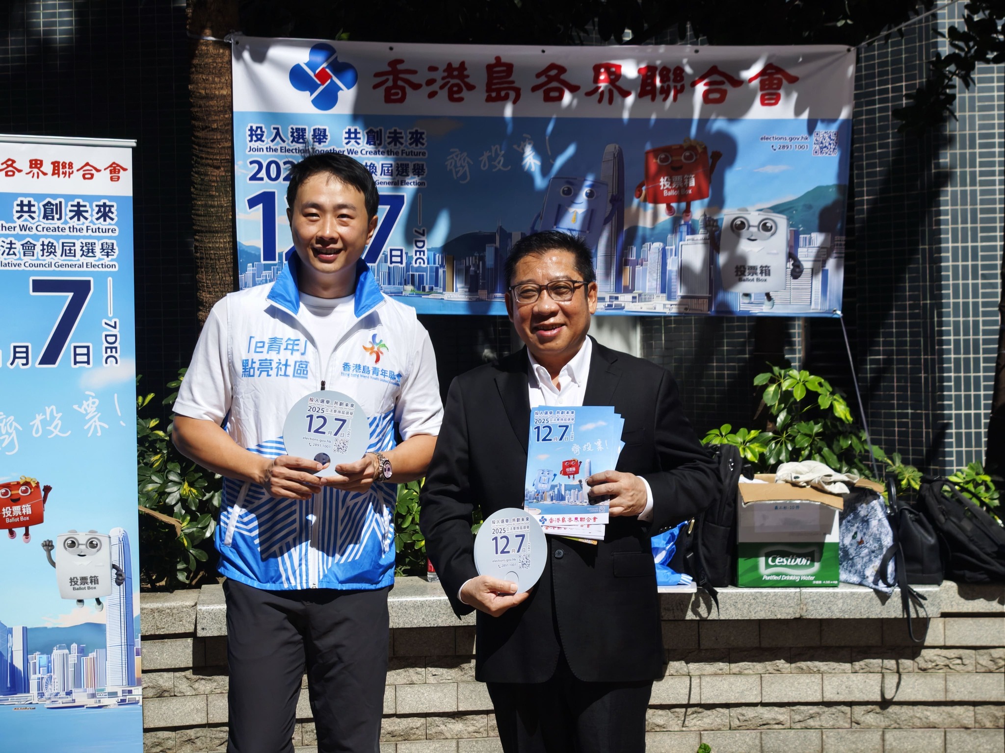本會理事長蘇長榮;副理事長胡志禧親身出席街站,並帶領義工一同向市民廣發宣傳單張,以此宣揚選舉對香港長期繁榮穩定的必要性,以及呼籲市民於12月7日踴躍投票,齊心協力共建美好家園。