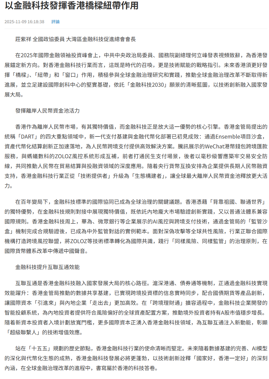站在「十五五」規劃的歷史節點,香港金融科技行業的使命清晰而堅定。未來隨着數據基建的完善、AI模型的深化與代幣化生態的成熟,香港金融科技發展必將更蓬勃,以技術創新詮釋「國家好,香港一定好」的深刻內涵,在全球金融治理改革的進程中,書寫屬於香港的科技答卷。