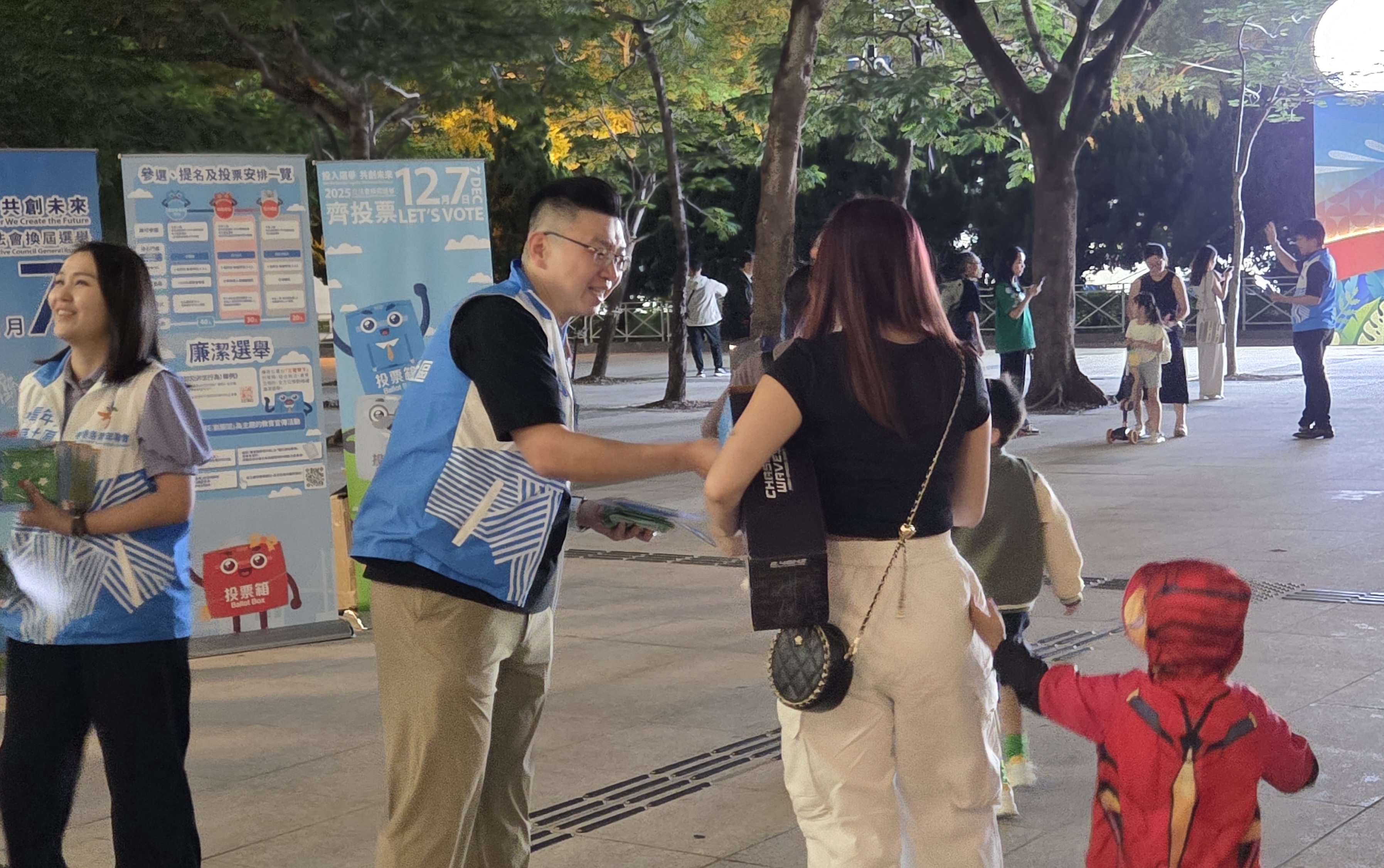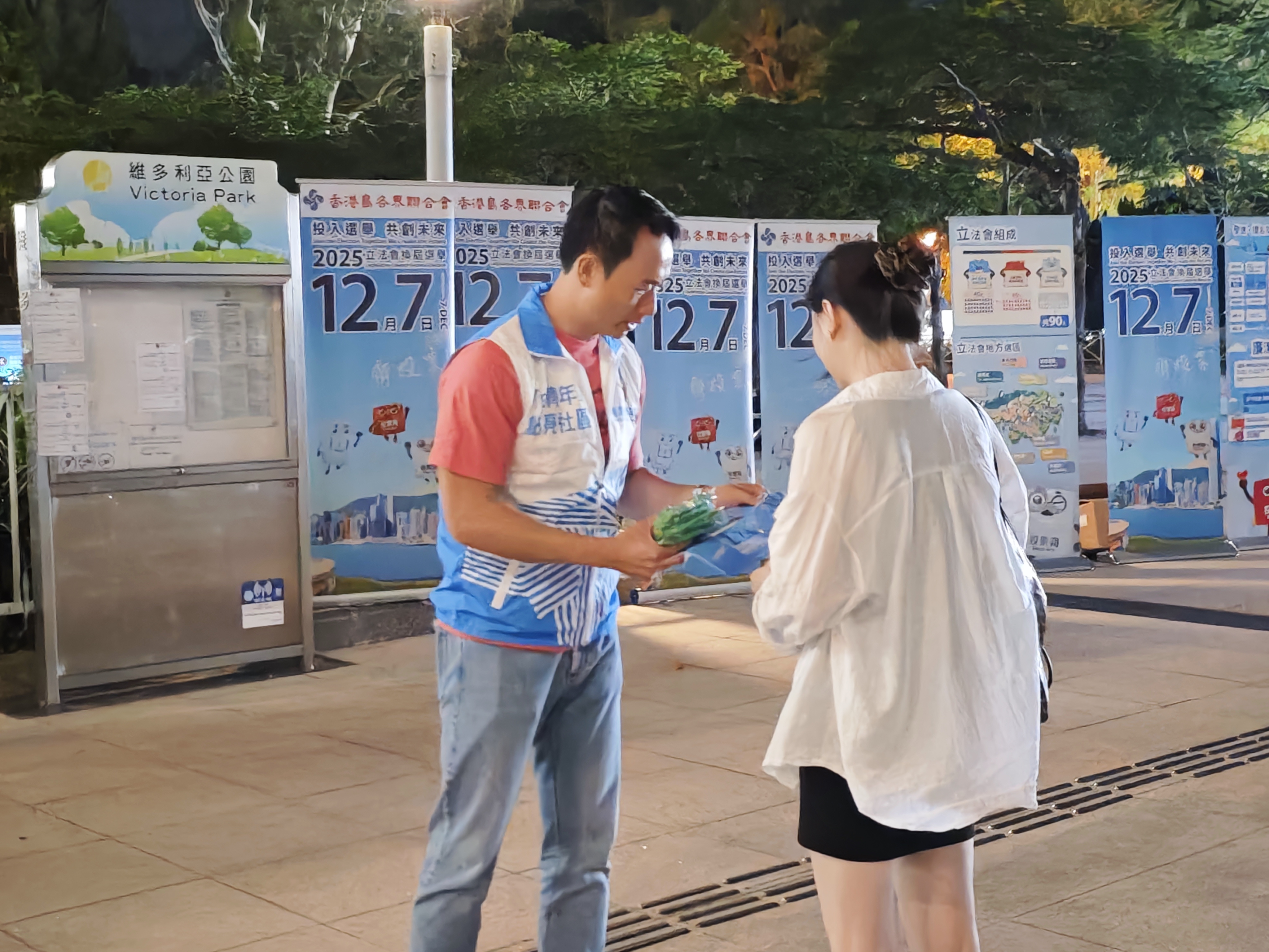 本會副理事長胡志禧、總幹事徐景勝,聯同10位青年義工在街站向市民派發宣傳單張及宣傳紀念品,以宣揚立法會選舉的重要性,並呼籲廣大市民積極參與12月7日投票,選出賢能之士為香港服務。