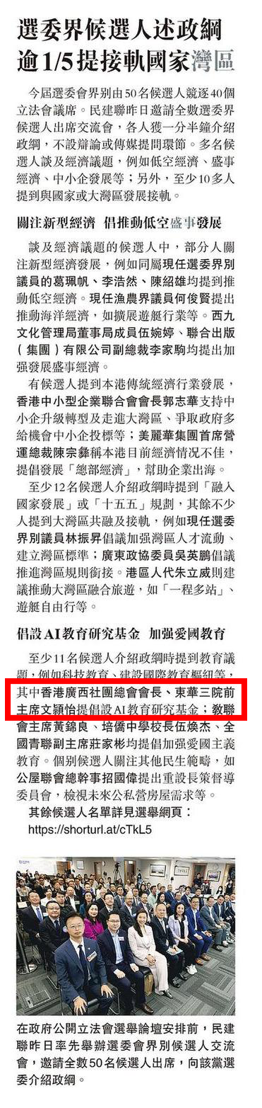 3號候選人,廣西社團總會會長文頴怡指當選後將推動香港在五大方面的高質量發展,包括與內地協同發展,設立AI教育研究基金;推動中西醫協作;提升專業服務能力等。