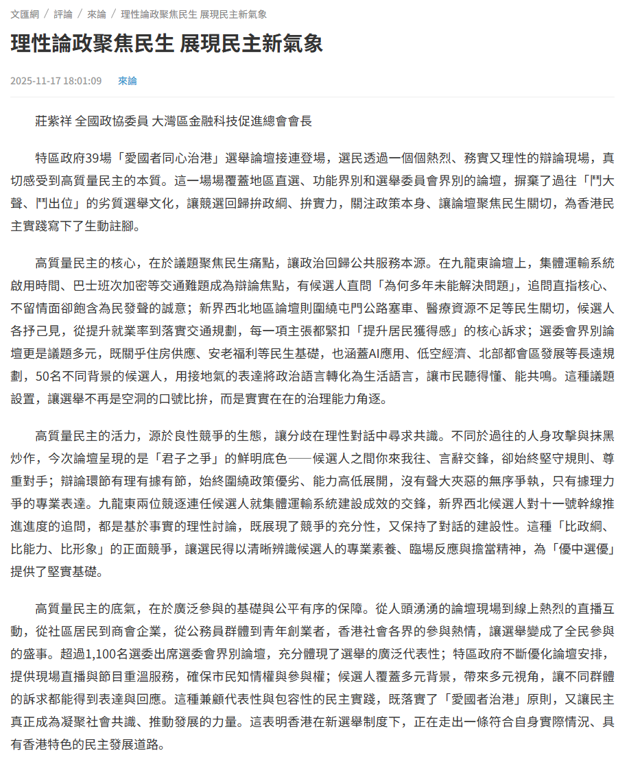 特區政府39場「愛國者同心治港」選舉論壇接連登場,選民透過一個個熱烈、務實又理性的辯論現場,真切感受到高質量民主的本質。這一場場覆蓋地區直選、功能界別和選舉委員會界別的論壇,摒棄了過往「鬥大聲、鬥出位」的劣質選舉文化,讓競選回歸拚政綱、拚實力,關注政策本身、讓論壇聚焦民生關切,為香港民主實踐寫下了生動註腳。