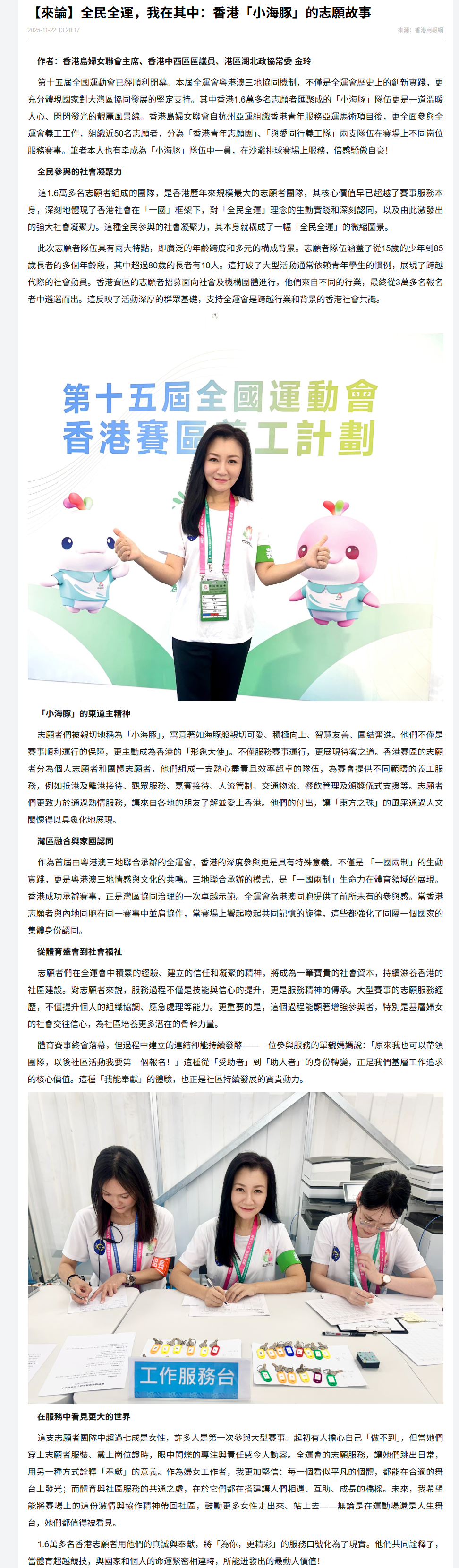 志願者們在全運會中積累的經驗、建立的信任和凝聚的精神,將成為一筆寶貴的社會資本,持續滋養香港的社區建設。對志願者來說,服務過程不僅是技能與信心的提升,更是服務精神的傳承。大型賽事的志願服務經歷,不僅提升個人的組織協調、應急處理等能力。更重要的是,這個過程能顯著增強參與者,特別是基層婦女的社會交往信心,為社區培養更多潛在的骨幹力量。