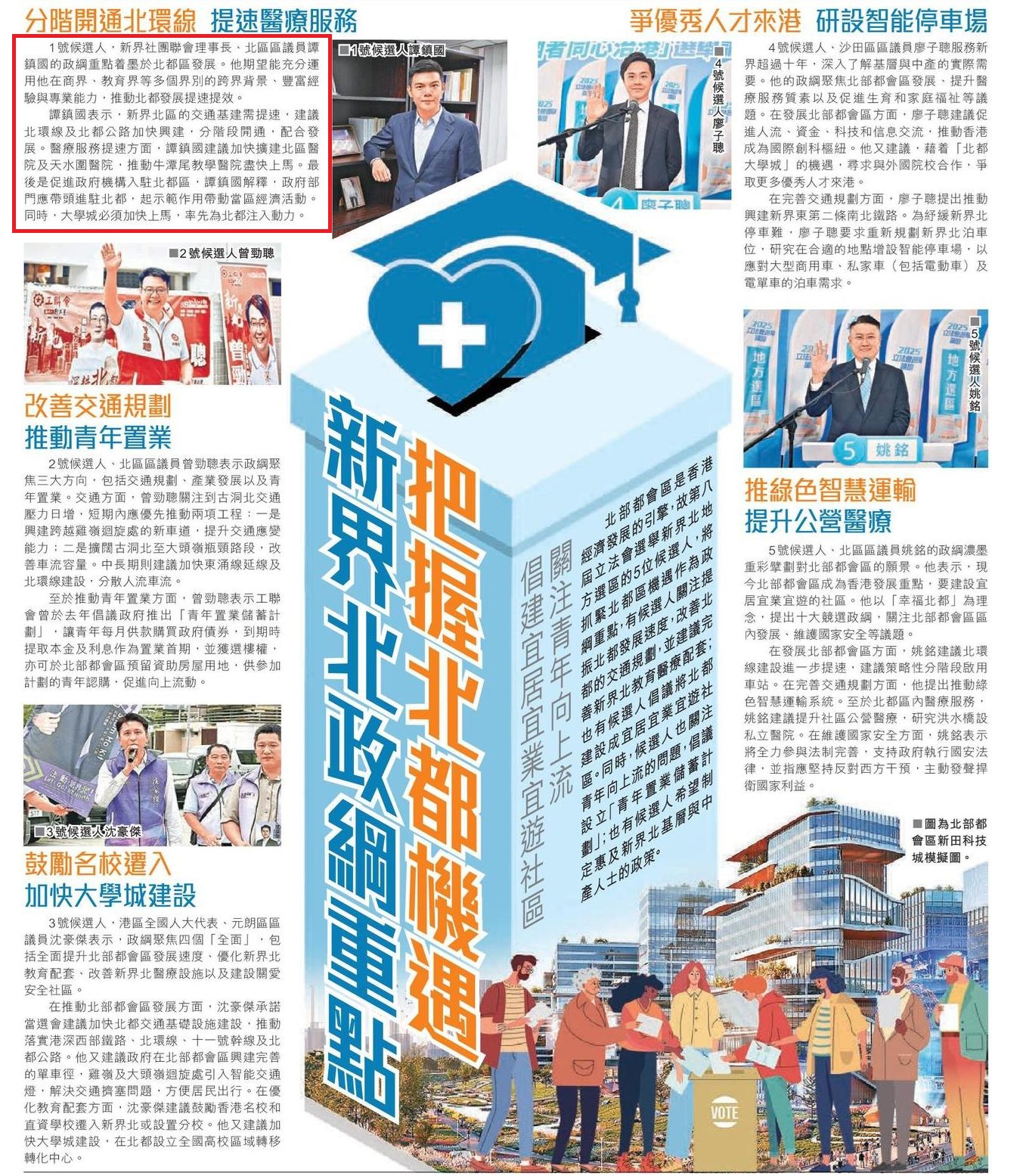 1號候選人,新界社團聯會理事長、北區區議員譚鎮國的政綱重點着墨於北都區發展。他期望能充分運用他在商界、教育界等多個界別的跨界背景、豐富經驗與專業能力,推動北都發展提速提效。