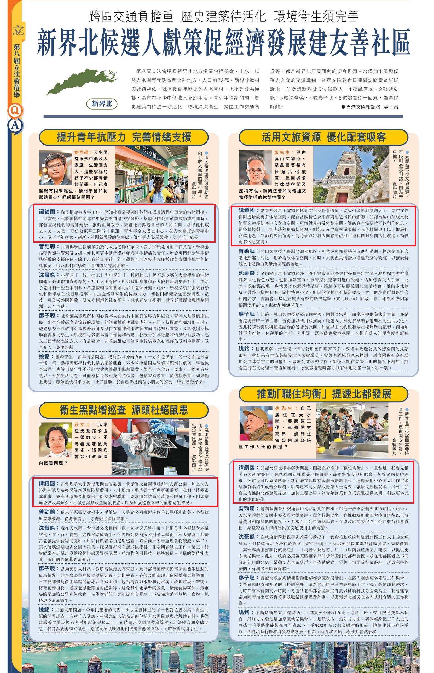 譚鎮國:我長期從事青年工作,深知社會需要關注他們在成長過程中面對的情緒困擾。一旦當選,我將積極推動建立更完善的情緒支援網絡,幫助他們發展就業或學業的同時,亦會重視他們的精神健康,推動正向教育,鼓勵他們擁抱自己的不同面向,陪伴他們成長。另一方面,可仿效東華三院的「東蒲」青少年全人成長中心,在天水圍打造青年中心,孕育青年創意、創新、消閒新體驗的好去處,讓年輕人發展興趣,培育正向成長。