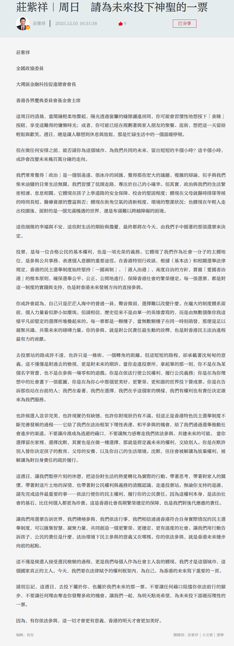 這週日,讓我們暫停片刻的休憩,把這份對生活的熱愛轉化為實際的行動。帶著思考,帶著對家人的關懷,帶著對這片土地的深情,也帶著對公民權利與義務的清醒認識,走進投票站。無論你支持的是誰,請先完成這件最重要的事——依法行使你的民主權利,履行你的公民責任。因為這權利本身,是法治社會的基石,比任何個人都更為珍貴。這是香港社會長期繁榮穩定的保障,也是我們對後代應盡的責任。