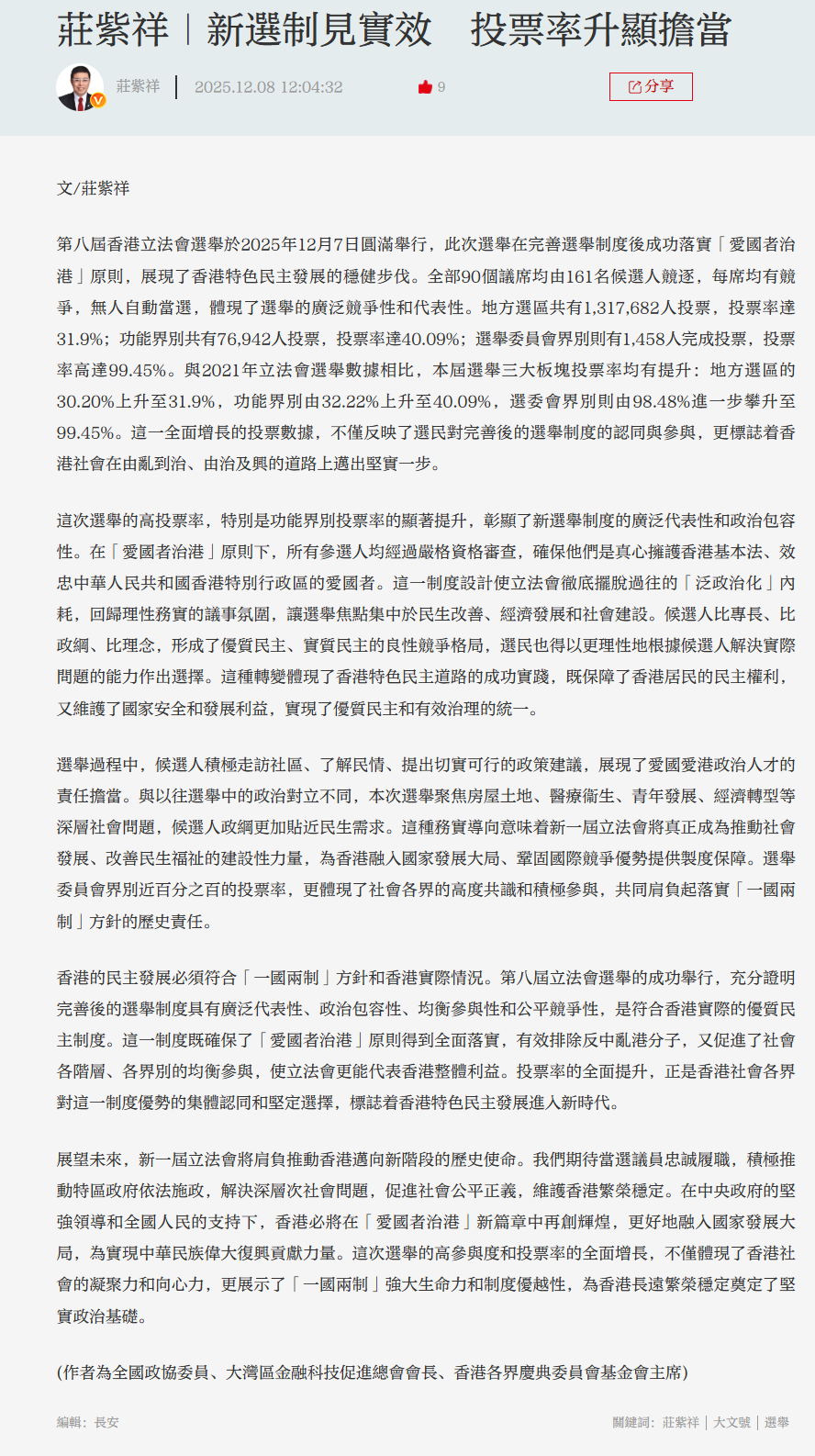 香港的民主發展必須符合「一國兩制」方針和香港實際情況。第八屆立法會選舉的成功舉行,充分證明完善後的選舉制度具有廣泛代表性、政治包容性、均衡參與性和公平競爭性,是符合香港實際的優質民主制度。這一制度既確保了「愛國者治港」原則得到全面落實,有效排除反中亂港分子,又促進了社會各階層、各界別的均衡參與,使立法會更能代表香港整體利益。投票率的全面提升,正是香港社會各界對這一制度優勢的集體認同和堅定選擇,標誌着香港特色民主發展進入新時代。